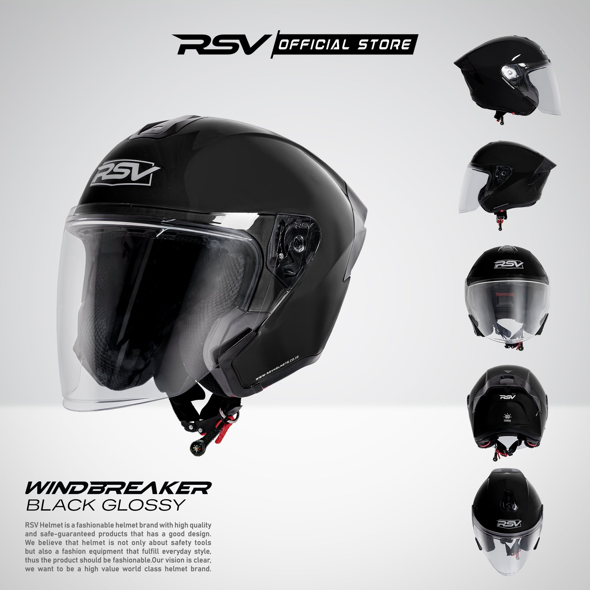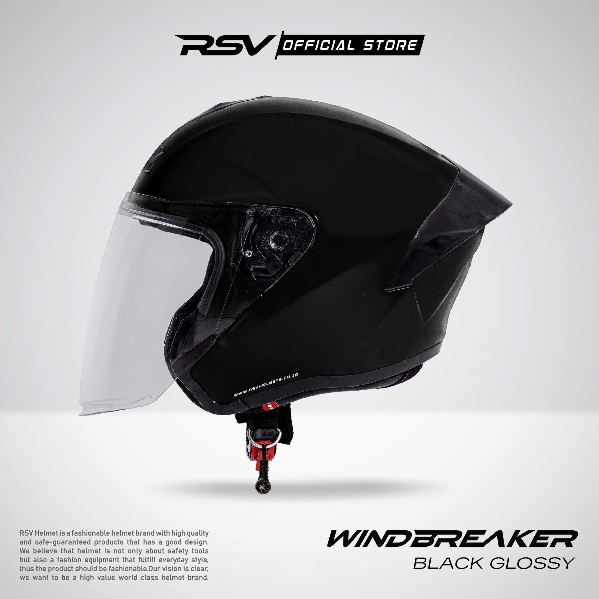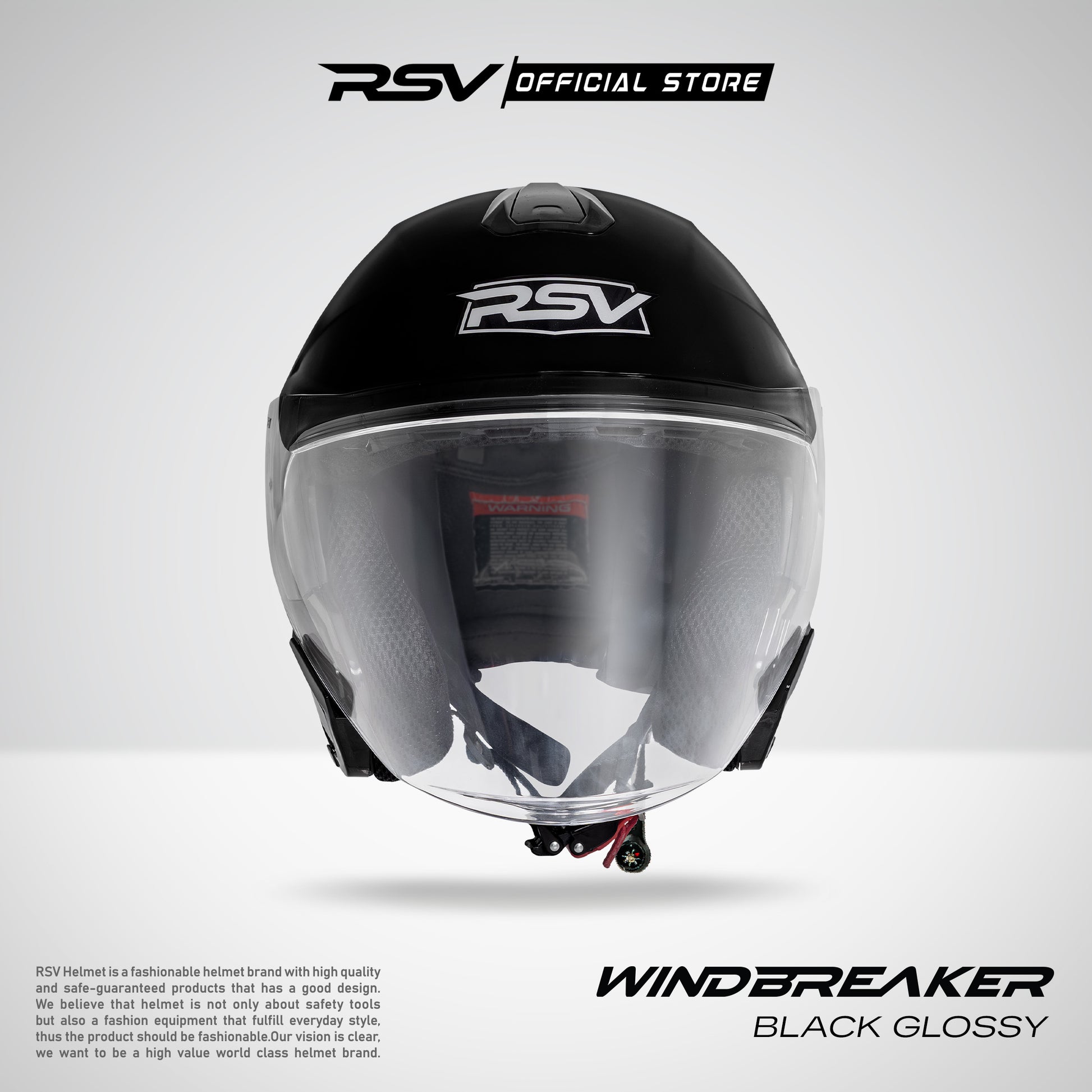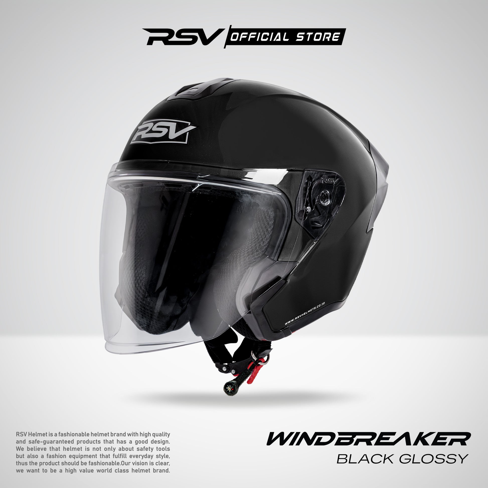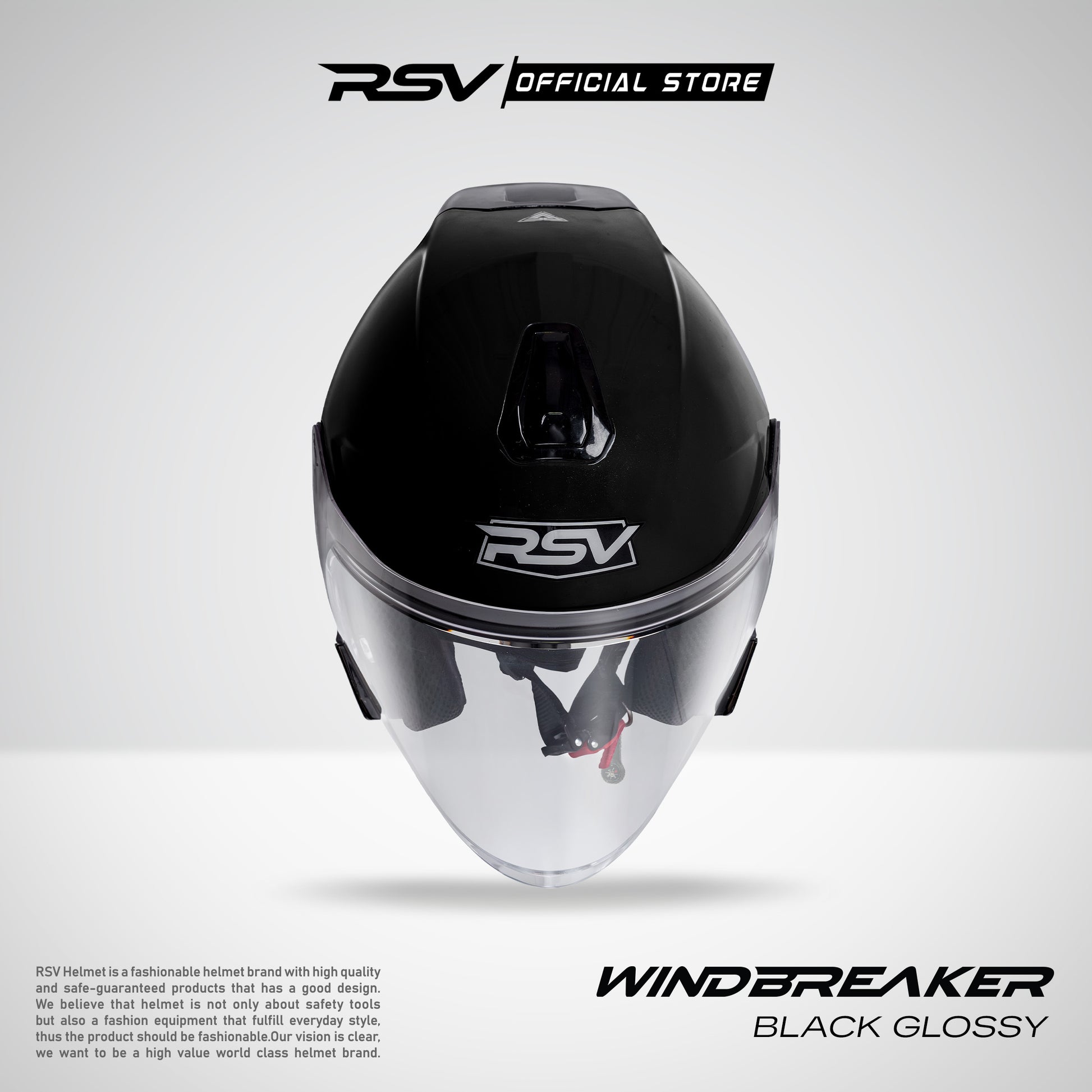 RSV Windbreaker Solid Black Glossy Single Visor - Helm Half Face SNI Unisex. Dirancang dengan garis aerodinamis dan detail modern untuk performa yang stabil dan tampilan berkelas! Membuat setiap perjalanan terasa lebih tenang dan berkarakter! 🚗